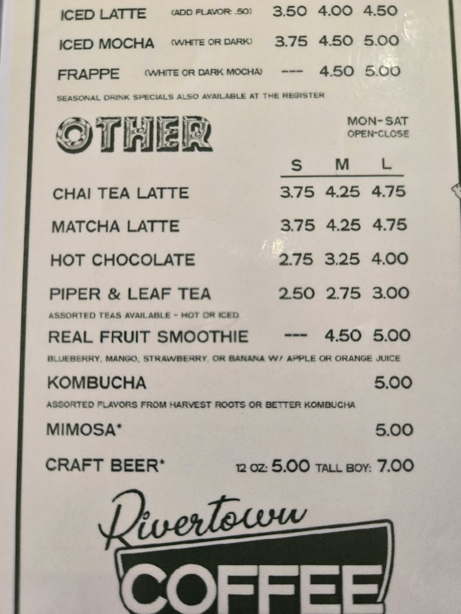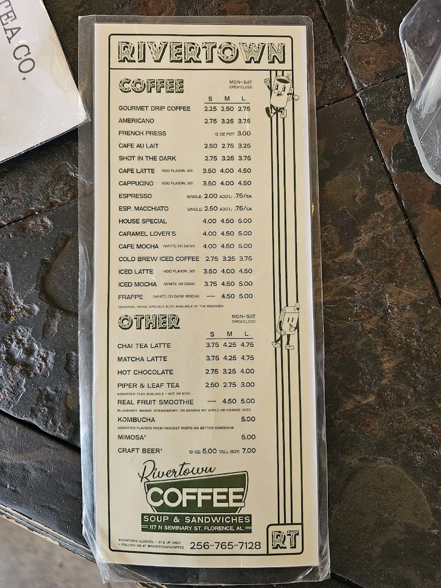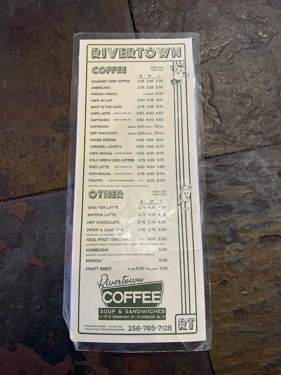 If you're in the mood for a cozy spot to enjoy a freshly brewed cup, look no further than the charming Rivertown Coffee Menu. Nestled in the heart of Florence, AL, this welcoming café offers a delightful variety of coffee, teas, and pastries. Whether you're stopping by for a quick espresso or indulging in a decadent latte, there's something for every coffee lover here. Their selection of baked goods pairs perfectly with any drink, making it the ideal place to relax or catch up with friends. With a warm, inviting atmosphere, Rivertown Coffee is more than just a place to grab your caffeine fix-it's a spot where you can unwind and savor every sip.
